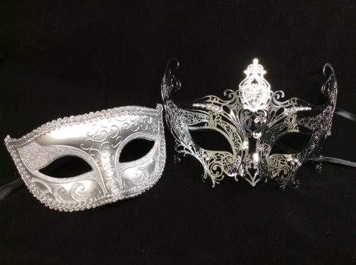 -. Title : His & Hers Masquerade Couples Venetian Design Masks - 2 Piece Silver Colored Set - Perfect Couple Mardi Gras Long Queen Party Halloween Ball Prom