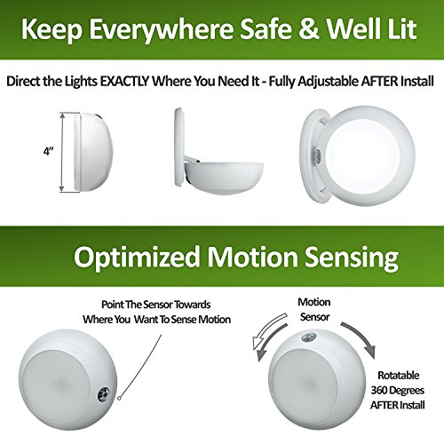 DIRECT & ANGLE YOUR MOTION-LIGHT WHERE YOU WANT IT – ALSO ADJUSTABLE SENSING UNLIKE THE COMPETITION! Direct the light-beam – great for brightening tight spaces and adjust so just right for sleeping babies. The movement-sensor can rotate 360 degrees after install ensuring your product comes on when – and only when you want