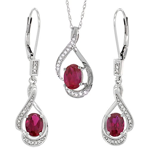 -. Title : 14K White Gold Enhanced Ruby Lever Back Earrings & Pendant Set Diamond Accent