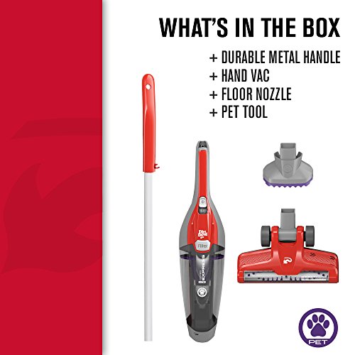 The Dirt Devil power express lite pet is lightweight, easy to store and is perfect for small spaces and pets. This versatile vacuum is everything you need in one compact design. The stick vacuum is equipped with a powered brush roll that works hard on carpet and hard floors. It also easily converts to a hand vacuum for above floor cleaning. Just pop on the pet tool to tackle pet hair on upholstery, stairs, pet beds and furniture. The rinsable filter, easy empty dirt cup and compact design make it easy to use, maintain and store.Feature