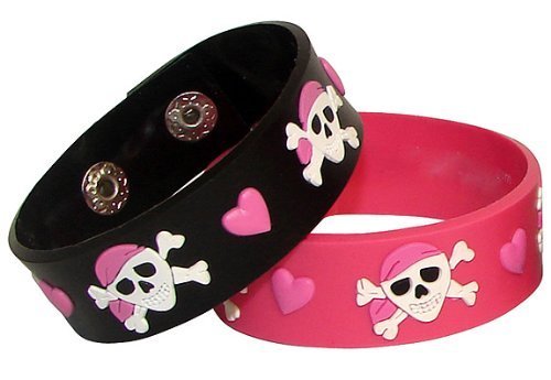 These black and pink rubber bracelets with skulls and hearts are fun favors for a slumber party or pirate party! WARNING: CHOKING HAZARD - Small parts. Not for children under 3 years. 8"