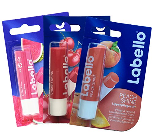Labello Watermelon Shine, Cherry Shine and Peach Shine lip balms bundle. A great selection of lip balms from Labello for every day. Enjoy the different flavours regarding your mood and take care of your dry or chapped lips. The Labello Shine line provides a subtle color and long-lasting moisture.Feature