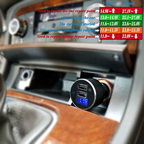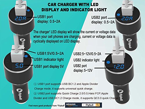 ★Flybull car charger has the function of detecting the battery voltage of the car. The charger's LED display shows the vehicle's real time voltage when the charger is not used to charge. (vehicle voltage reference: normal - 13.0V to 14.8V for engine running and 11.8V to 12.8V for engine stop) Check your car battery, when the car charger display voltage is less than 11.5v)