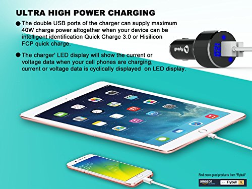 ★Daul USB port output 40W maximum power, which enough to charge two iPads. Flybull Led display car charger intelligent circuit is designed to prevent short circuit, overheating, overcurrent and overcharge.
