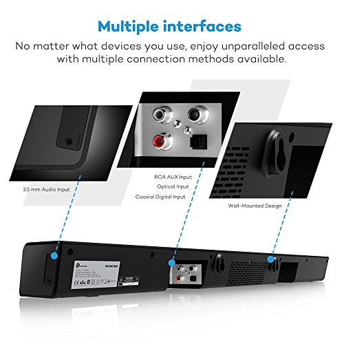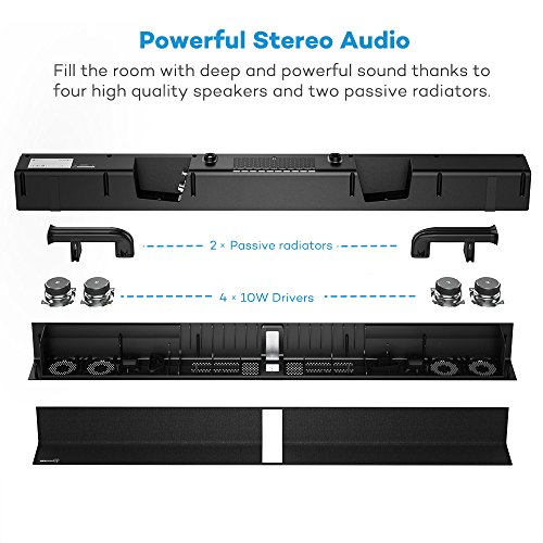 Soundbar, TaoTronics Sound Bar Wired and Wireless Bluetooth Audio ( 40 Watt Speaker,34-Inch, 2 Passive Radiators, Dual Connection Methods, Touch and Remote Control, Wall Mountable, Updated Version)