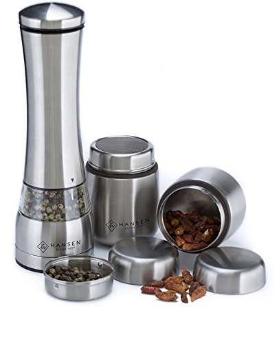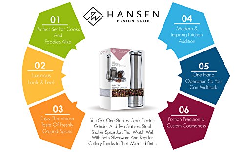 LIFETIME GUARANTEE – Hansen Design Pepper and Salt Mills earn superior marks for design, construction, and durability. If you don’t absolutely love your electric salt and pepper grinder set, just send it back for a full refund!