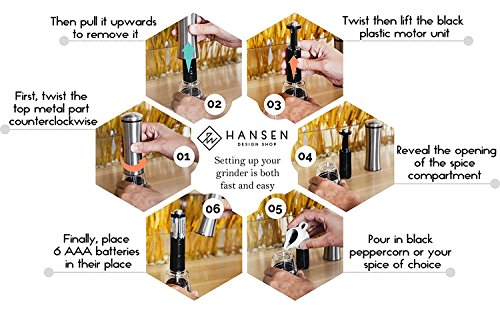 DELICIOUS MEALS – With Hansen Design Electric Pepper Grinder you’ll never have to worry about over-flavoring your food! The LED light of the Automatic Pepper Grinder illuminates your food so you can always control how much seasoning is being used!