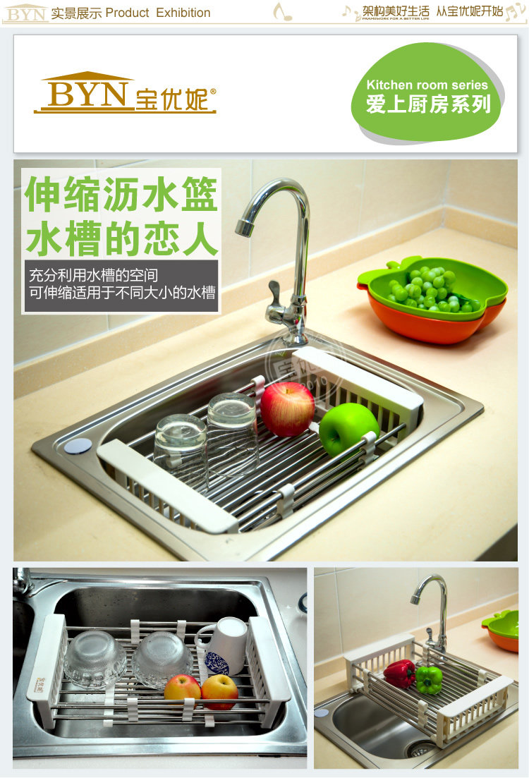 1、可自由伸缩调节宽度的水槽沥水架,适应不同型号的水槽,功能强大,沥水的同时能实现碗碟架、杯架、洗菜篮等功效,是现代居室生活的完美体现;