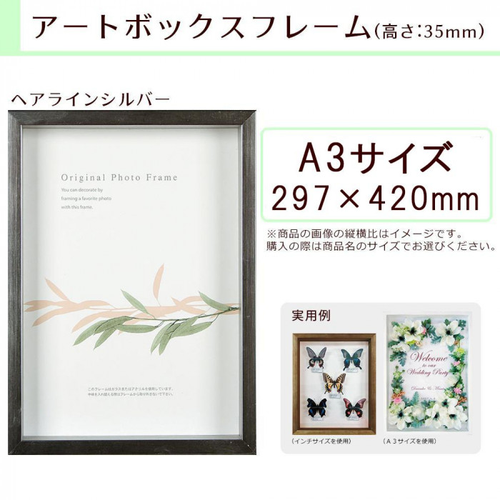 深さ25ミリの立体の木製額。フィギュアBOXとして、フラワーアレンジメントやウェディングボードとしても最適。 製造国:日本 素材・材質:フレーム:木、前面:ガラス 重量:約1330g 仕様:規格:A3(内寸:297×420mm) 付属品:紐 ※サプライヤー直送品 ご注文後9~12営業日後の出荷となります【商品名】A.P.J. BOXフレーム アートボックスフレーム (高さ:35mm) A3サイズ(297×420mm) ヘアラインシルバー 0021768702