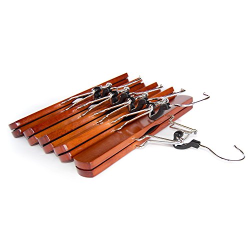 SET OF 12 WOODEN PANTS HANGERS - Proudly display a professional and elegant wardrobe with a boxed set of 12 beautiful cherry finished wooden slacks hangers. Perfectly define luxury style and fashion.