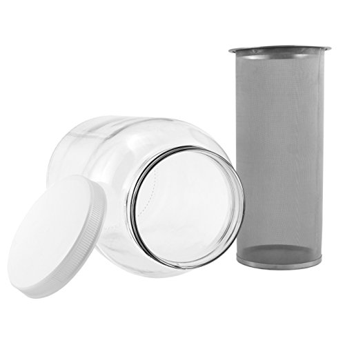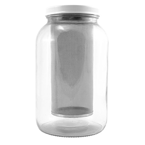 STAINLESS STEEL & GLASS: Stainless steel filter with fine mesh is plastic free. Gallon glass mason jar (10” tall by 6” diameter). Note that lid is bpa-free plastic.