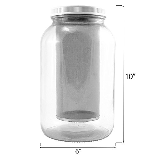 TALL FILTER: This 9-inch tall filter is excellent for a gallon jar and has a generous ¼ inch wide rim that holds on the rim of your jar. Strainer filter capacity: approx. 5.5 cups. 3.5 inches diameter.