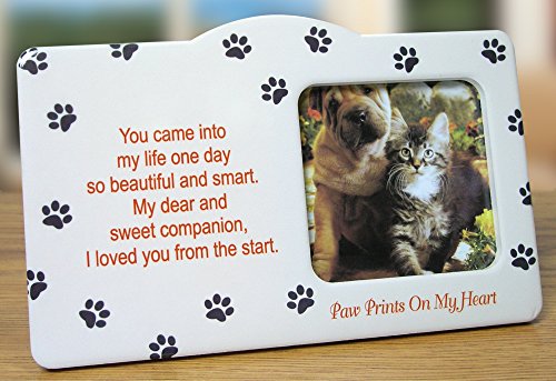 - CHRISTMAS MEMORY ORNAMENT AND FRAME. Beautiful paw print picture frame for anyone who has lost their special fur baby. Inspiring paw print poem sits next to the picture of your faithful companion. Proudly display this picture frame on a deck, countertop, bookshelf, mantle, dresses, tv entertainment unit, kitchen island or nightstand. This will give you comfort knowing your special friend left paw prints on your heart