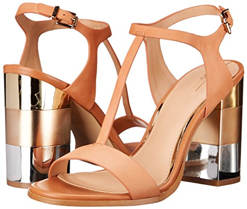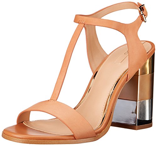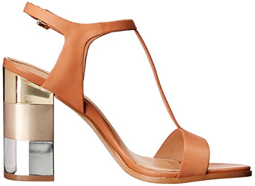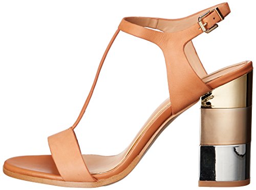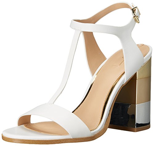 Leather T-strap sandal featuring block heel with trio of metallic insets