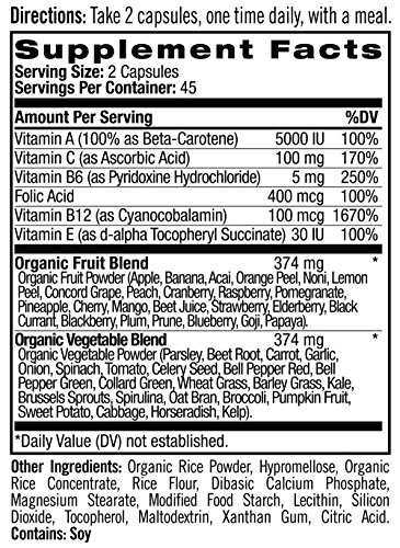 -. Feature : Promotes full body health / Provides nutrients from 46 organic fruits, vegetables, grains and greens / Includes superfoods such as acai, blueberries, goji berries, pomegranate, spinach, / Made with organic ingredients / Non-GMO, Gluten-free and 100% Vegetarian