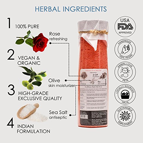 100% PURE, VEGAN, HANDMADE, ORGANIC INDIAN FORMULATION: Vitamin E rich Soulflower Kashmiri Rose Bath Salt is 100% pure traditional Indian remedy containing solar-dried Indian Ocean sea salt, pure rose essential oil and olive oil.