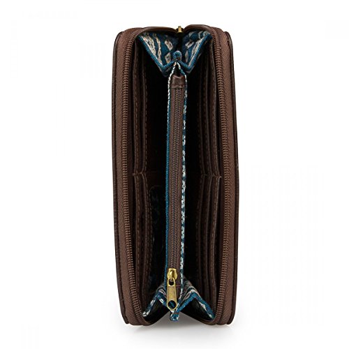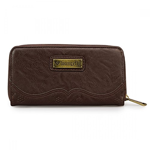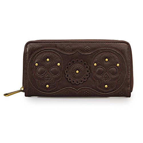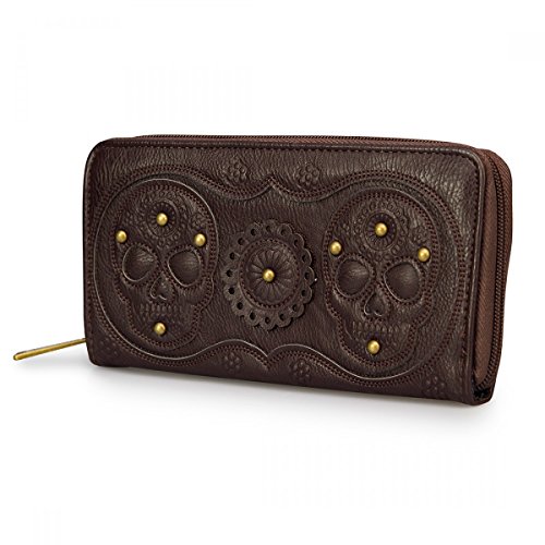 FAUX LEATHER ZIP AROUND WALLET WITH FAUX LEATHER APPLIQUE AND METAL STUDS. MEASUREMENTS: W: 8 X H: 4"