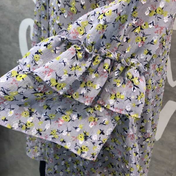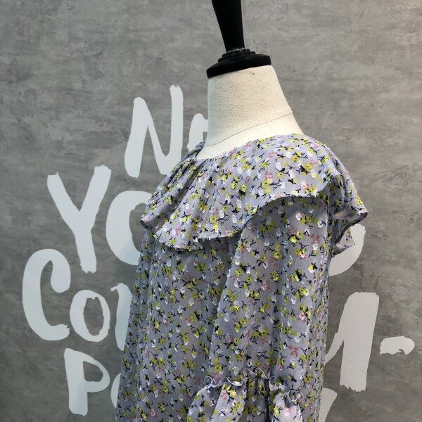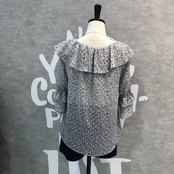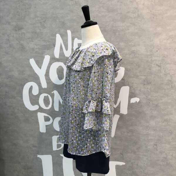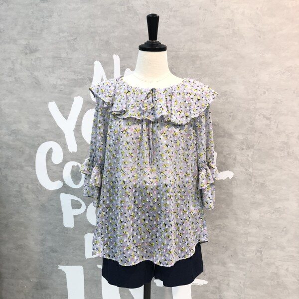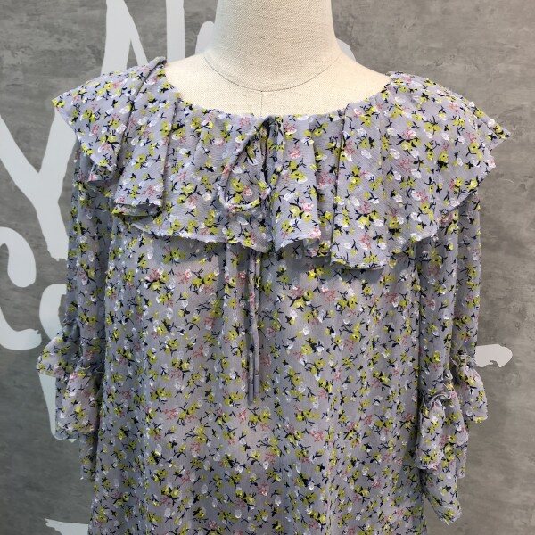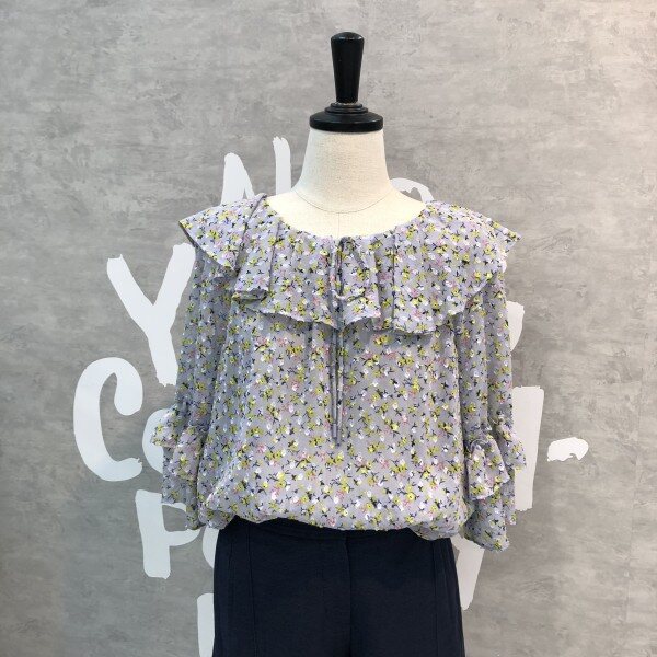 은은한 플라워패턴이 세련된 시스루 블라우스로 소매프릴과 라운드 넥이 여성스러운 디자인의 시원한 아이템입니다