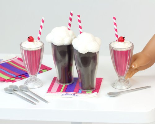 - Title : 18" Doll Play 12 Pc. Soda Fountain Set, 2 Root Beer Ice Cream Floats, 2 Strawberry Smoothies, 4 Spoons & 4 Napkins Perfect for 18 Inch American Girl Doll Food & More!