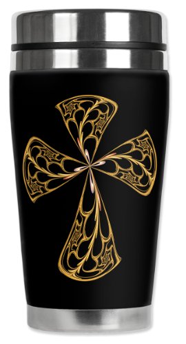 Mugzie Gold Cross Travel Mug with Insulated Wetsuit Cover, 16 oz, Black