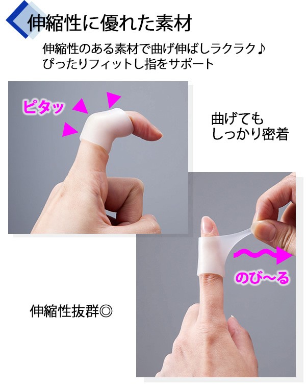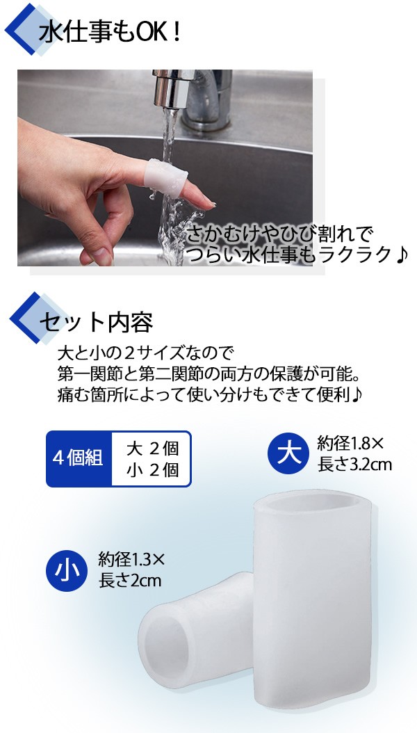 | 関節の痛みやあかぎれ、さかむけの痛みを緩和する指のサポーター。伸縮性のある素材でぴったりフィット!大小サイズが2個ずつセットになっているので第一関節と第二関節の両方の保護が可能!痛む箇所によって使い分けもできて便利♪つけたまま水仕事もOK!男女兼用。全指共通。 |