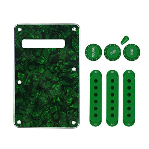 Studio : iknmusic Publisher : iknmusic Product Description Feature: * Set of Gutiar Back Plate, Pickup Covers, Knobs and Tips for Strat Style Gutiar or similar replacement.* All materials are environmentally friendly, thermostability, no smell. Multi-layer plates are pressed under high temperature and pressures, to make them close integration between each layer, will not appear curly, deformation, or separation of different layers.Two layers of protective films on the front of Back Plates, anti-scratch to protect the back plate.Specification:* Item: Back Plate Pickup Covers 2T1V Knobs 5 Way Switch Tip Tremolo Whammy Bar Tip.* Back Plate: L 145mm, W 93mm; Pickup Covers: 50/50/52mm Style; * Knobs: 2Pcs Tone and 1Pcs Volume Control Knobs; Switch tip: for 5 Way Strat Style Guitar switch or similar.* Material: Back Plate: Made of 4Ply, 3Ply PVC and 1Ply Pearl Celluloid Plate. Guitar Parts: Plastic PVC* Color: Back Plate: Green Pearl; Guitar Parts: Green.* Back Plate is with protective film on the surface, while using please split it off.* Note:Item's color might be different from the picture because of the aberration.Package Includes:1 x Back Plate50/52/52 Pickup Covers2T1V Knobs1 x Switch Tip 0