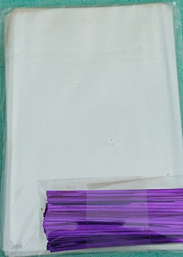 Clear Cello/Cellophane Bags - Flat - 100 Bags 5x7 inch with 100 Twist Ties (Purple)