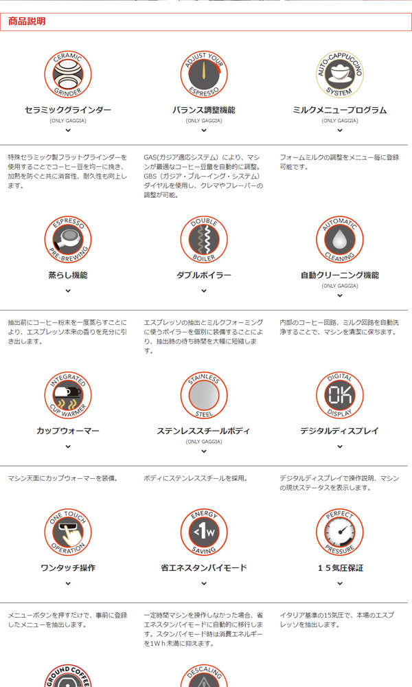 ●バランス調整機能(ONLY GAGGIA):GAS(ガジア適応システム)により、マシンが最適なコーヒー豆量を自動的に調整。GBS(ガジア・ブルーイング・システム)ダイヤルを使用し、クレマやフレーバーの調整が可能