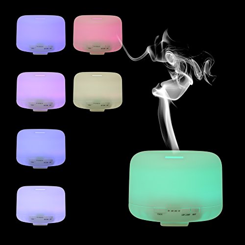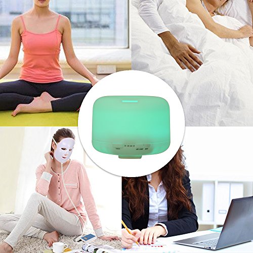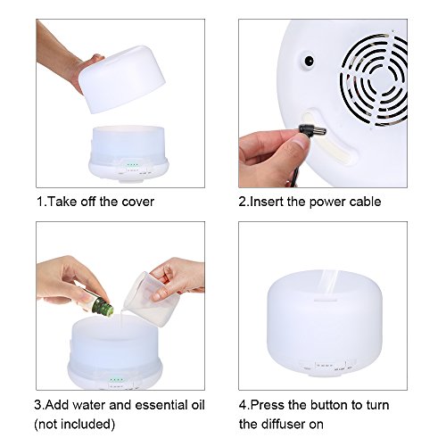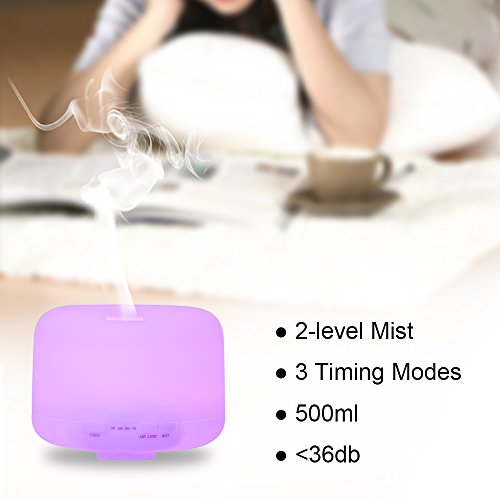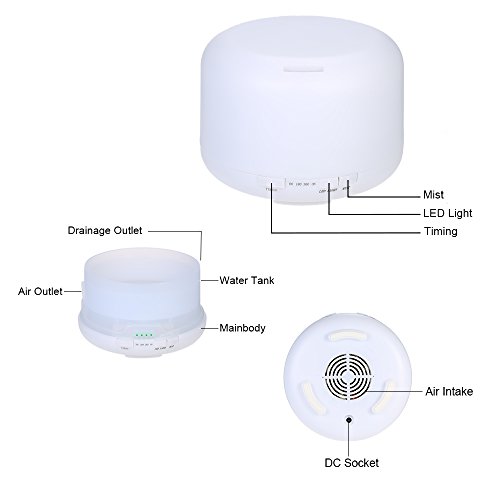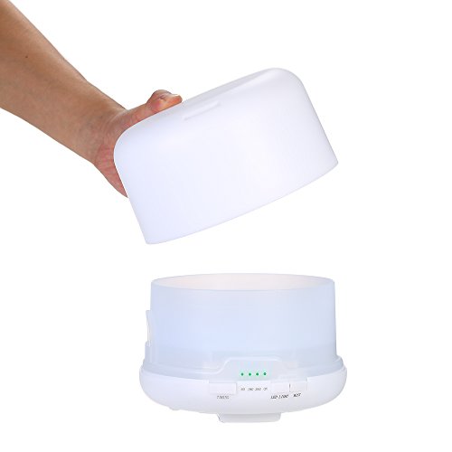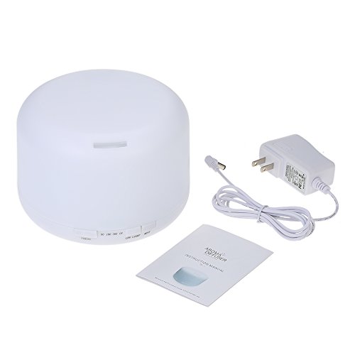 Features: ULTASONIC: Adopt ultrasonic technology to disperse essential oil. Easier to be absorbed by lung and skin,enhance aromatherapy care to help you relax. INCREASE HUMIDITY: Produce fine, even and soft mist, increase room humidity, improve dry skin. 2-LEVEL MIST: 500ml water capacity for long time humidification, 2 levels of spraying intensity as choice. 7 CHANGING COLORS: Night lamp with 7 LEDs provide dynamic changing color or static color. Create a serene atmosphere to help you fall in sleep and get a good mood. TIMING POWER CUT: Safe to work when you are sleeping. Automatically cut power when there is lack of water or when the time is up in 60min / 180min / 360min timing mode.