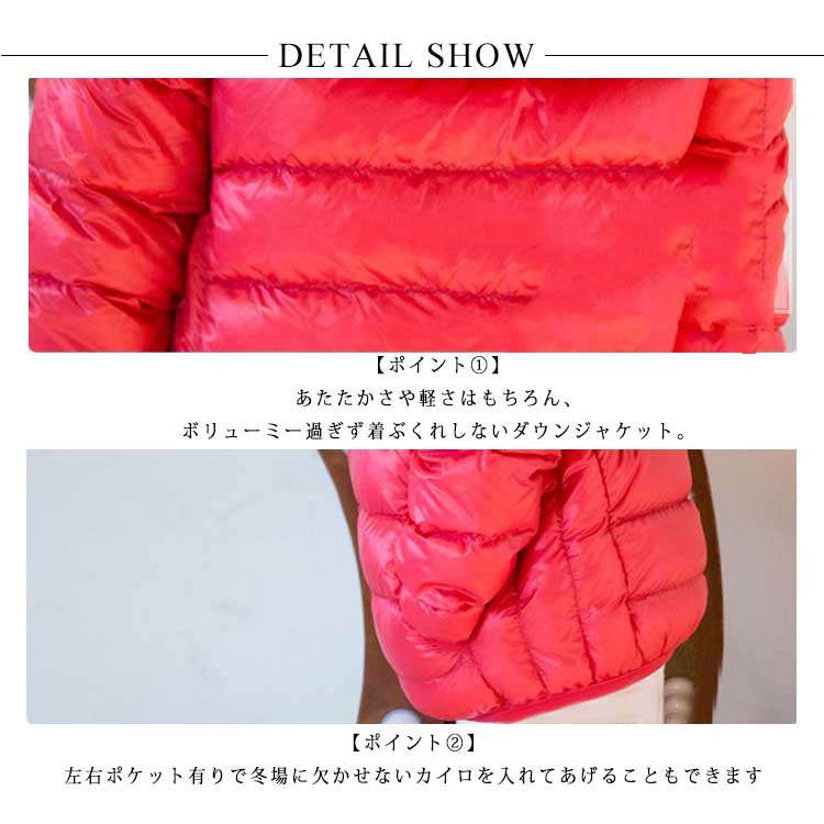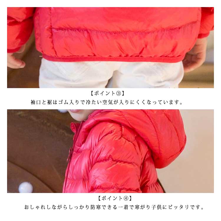 | シンプルで合わせやすい子供用中綿コート♪密度の高いするりとした肌触りのポリエステル素材を使用。さらに中身にはダウン90%を使用。風を通しにくく、強度も◎ | |
