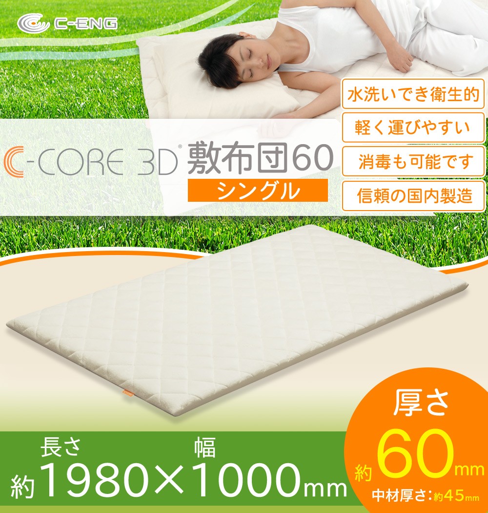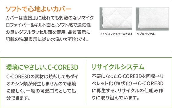 中材に使用しているC-CORE3Dは適度な反発力があり、体圧分散性に優れています。C-CORE3Dは繊維が網状に絡み合った構造をしているため、通気性に優れ、湿気がこもることがありません。カバーは直接肌に触れても刺激のないマイクロファイバー&キルト面とソフトで通気性の良いダブルラッセル面がありますので、シーズンに合わせてお使いいただけます。日本アトピー協会推薦品。空気が循環しやすく患部を衛生的に保てます。 |