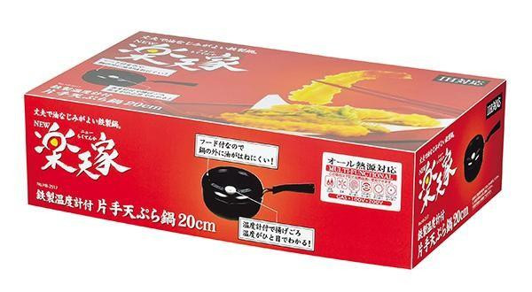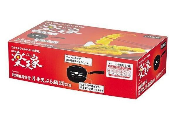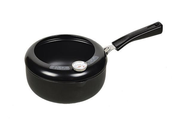 | 丈夫で油なじみのいい鉄製天ぷら鍋。フード付きなので鍋の外に油がはねにくくなっています。 |