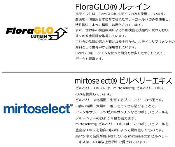 | ●FloraGLOルテイン、mirtoselectビルベリーエキスをはじめとした選りすぐりの原料のみを使用!! | | ●ベースオイルには健康成分「オレイン酸」を豊富に含むスペイン産エキストラバージンオリーブオイルを使用♪ | | ●植物性のソフトカプセルを使用。胃の中で溶けやすく、ゼラチンアレルギーの心配がありません。 | | ●厳しい品質管理・製造管理の元で安全性や品質が確保された国内の工場で製造しています。 |