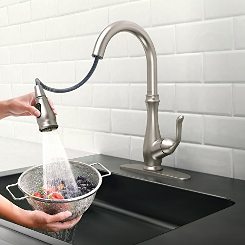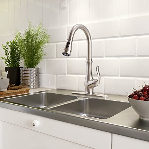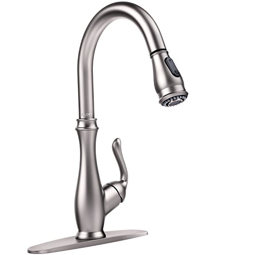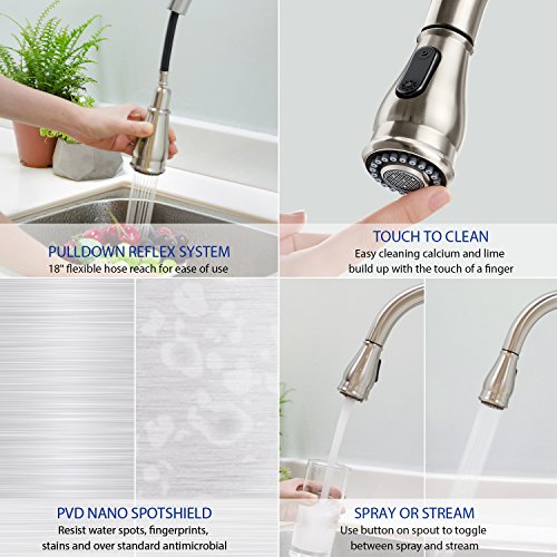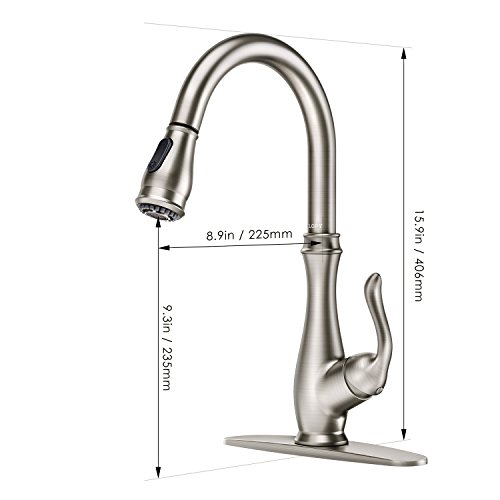 DETAIL INFORMATION: Single handle sink faucet / 360 degrees swivel spout / Two water modes - stream and spray / High-arc spout with 18 inches sink faucet pull down sprayer / Ceramic disc valves