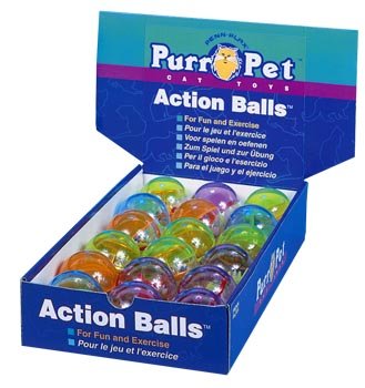 -. Feature : Purr-Pet action balls for fun and exercise / Packed in cylinder bin for counters, pegboard ring or display rack / This product is made in China