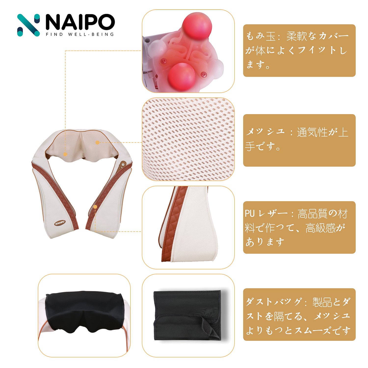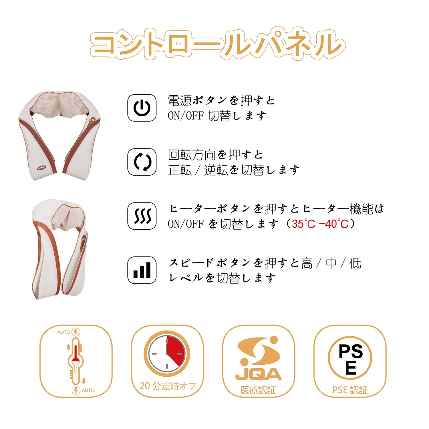 【指圧マッサージ】:まるで人の手でマッサージしてくれるような心地よさ。4つのもみ玉を内蔵した指圧マッサージは実際のマッサージセラピストの手を模倣し、リラックスと筋肉の緊張緩和に役立ちます.