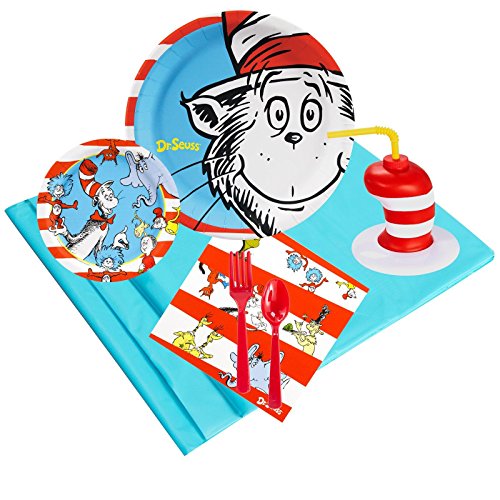 -. Feature : Includes 16 dinner plates, 16 dessert plates, 16 lunch napkins, 16 forks and spoons, 16 plastic molded favor cups, and 1 tablecover. / Add additional party tableware, decorations, favors, games, and activities to complete your celebration and entertain your guests. / Great for childrens birthday parties, kids school parties, a pizza party, or a theme party. / Features characters from favorite books such as Fox in Sox, Cat in the Hat, The Lorax, and Green Eggs and Ham.