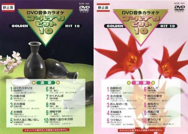 ■KCB-104 艶歌 01. 鳥取砂丘 (水森かおり) 02. 北の雪虫 (キム・ヨンジャ) 03. おんなの一生 (川中美幸) 04. 天城越え (石川さゆり) 05. つぐない (テレサ・テン) 06. 凛として (坂本冬美) 07. 明日の幸せ (原田悠里) 08. 夜桜お七 (坂本冬美) 09. 貴船の宿 (川中美幸) 10. 夢うぐいす (天童よしみ)