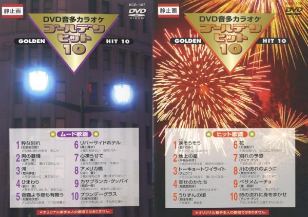 ■KCB-108 ヒット歌謡 01. 涙そうそう (夏川りみ) 02. 地上の星 (中島みゆき) 03. トーキョートワイライト (チェウニ) 04. 幸せのかたち (高橋真梨子) 05. うりずんの頃 (坂本冬美) 06. 花 (石嶺聡子) 07. 別れの予感 (テレサ・テン) 08. 川の流れのように (美空ひばり) 09. ベサメムーチョ (桂銀淑) 10. 時の流れに身をまかせ (テレサ・テン)