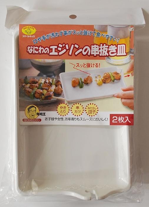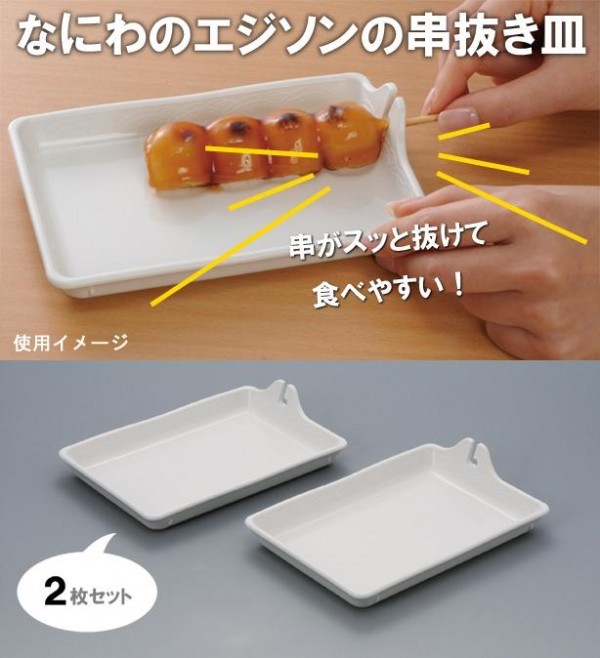 | なにわのエジソン木原さんが発明した串抜き皿です。やきとり、串カツ、みたらし団子などの食べにくい串料理を、この串抜き皿で食べやすく。電子レンジでの加熱も可能です。 |