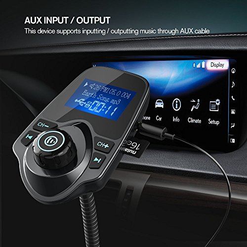 Support FM, Smartphones could be connected to T10 through Bluetooth, and then streamed through car FM system or Aux Port, Smartphones or MP3 players could also be connected to T10 through AUX port, and then streamed to car stereo speaker through FM;