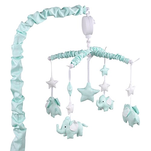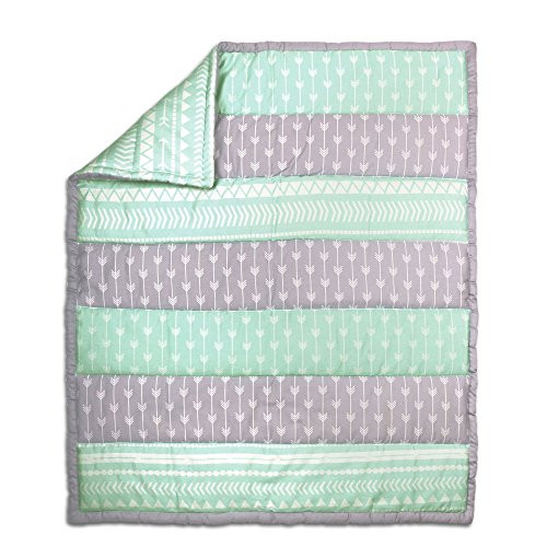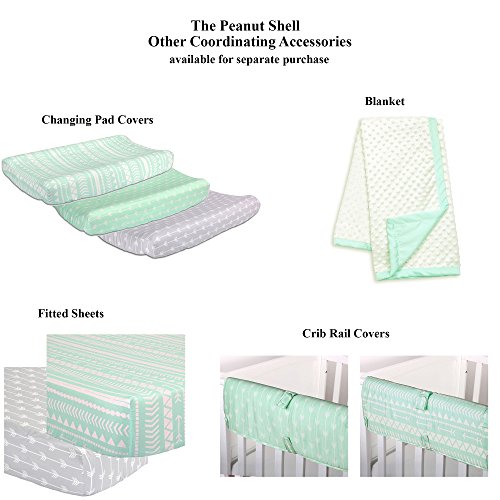-. Feature : 100% cotton sateen fabrics highlight this premium quality mint and grey arrow stripe crib bedding set; 4 piece set includes arrow stripe quilt, grey fitted sheet, tailored dust ruffle, and musical mobile; individual components of this set are also available for purchase separately / Generously sized at 44 by 37 inches, the 100% cotton quilt will find a host of uses in and out of the nursery, inside and outside the home; perfect for tummy-time / Crib skirt, with a 14 inch drop, and the fitted crib sheet are designed to fit a standard sized crib with a mattress measuring 52 by 28 inches; all-around elastic will assure that the sheet fits safely and securely every time / Musical mobile features mint green elephants and stars and plays a gentle lullaby to soothe baby to sleep / The Peanut Shell, through this mix and match collection, offers a host of coordinating items for your nursery, including: window treatments, crib rail guards, blankets, alternate sheets, and changing pad covers