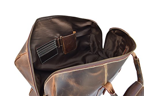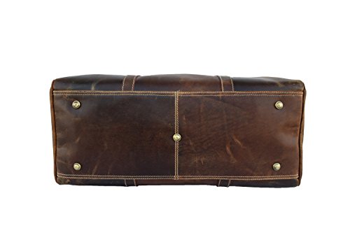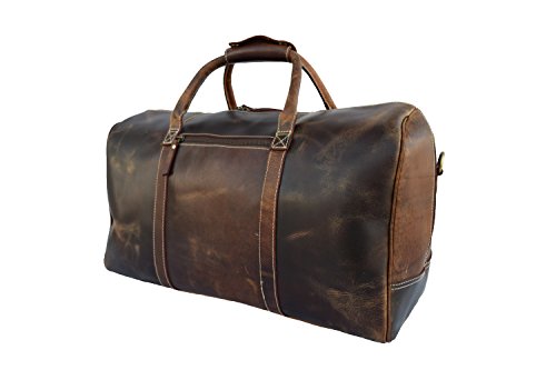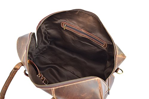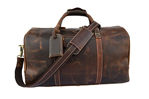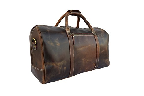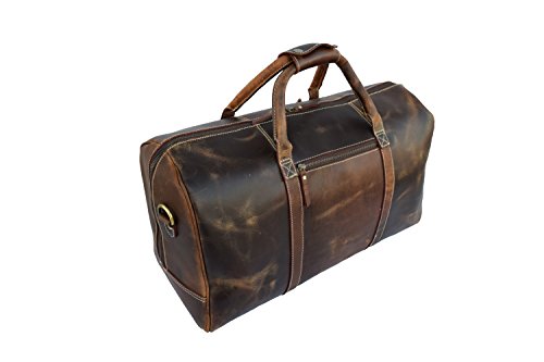 Product Description REAL CRAZY HUNTER LEATHER DUFFLE BAG A beautifully handcrafted vintage style real leather Duffle Bag that you will still be using years from now. 1.Item Description- ?Measurements (In inches): 20 (Length) x 11 (Height) x 7 (Deep) ?Weight: 2.0 kgs/ 5Lbs (approx) ?Front: 1 zipper pocket ?Backside: 1 zipper pocket ?Inside: 1 zipper pocket ?Inside: 1 mobile phone pocket, 2 pen pockets, 4 card holder slots ?1.5" wide and 58" long adjustable leather shoulder ?Double hand carry 2.Material Description- ?Genuine crazy hunter leather ?Inside flap is nicely lined with durable nylon lining. ?Heavy Duty Antique Brass Solid Accessories 3.CHARACTERISTICS OF HANDMADE LEATHER BAGS- ?Bag is hand cut, and hand stitched. Each one is individually made pure handmade bag with lasting durability. ?Each leather satchel is a totally natural product therefore the colors and the finish can vary from one piece to the next. ?Parts from several hides may be used to make a single leather bag. So there may be some variation in color and the textures to the different parts of a bag, which will create a wonderfully unique effect. ?Natural lines and marks in the leather are left fully exposed. There may also be visible creases in the leather. These features go to show the genuine origin of our leather satchels and messengers bags, they form part of the bag and not affect its durability. ?Our leather bags are handmade and your new leather bag may be subject to natural variation in its size. ?All this simply enhances the unique appearance of your bag and adds extra character. 0