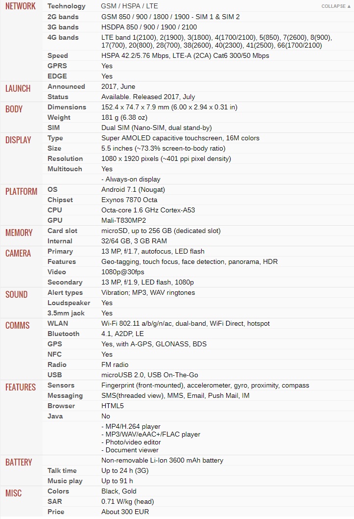 Android 7.1 (Nougat) Octa-core 1.6 GHz Cortex-A53 Exynos 7870