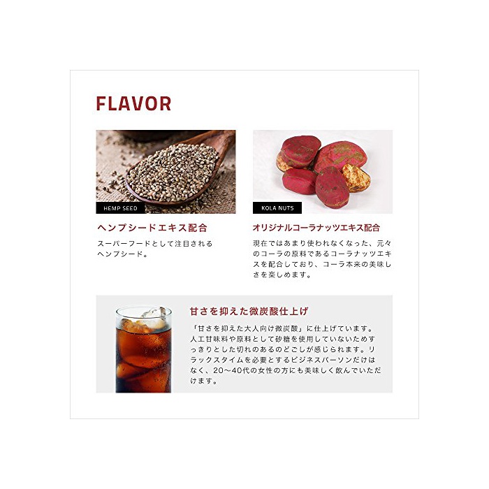 성분:과당 포도당액당,(HEMP)삼베 시드 엑기스,콜라 너트 엑기스,호프 엑기스,《갸바》/탄산,향료,카라멜 색소,신맛료,《데아닌》
