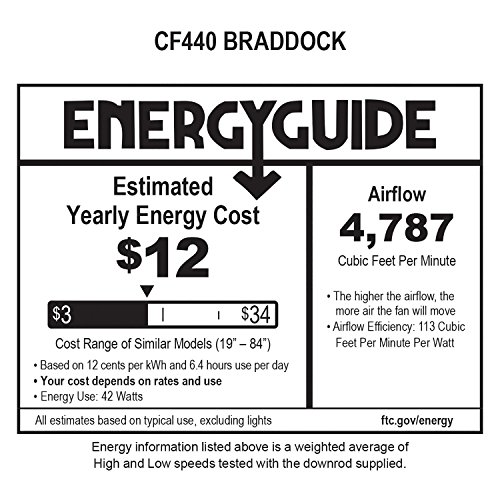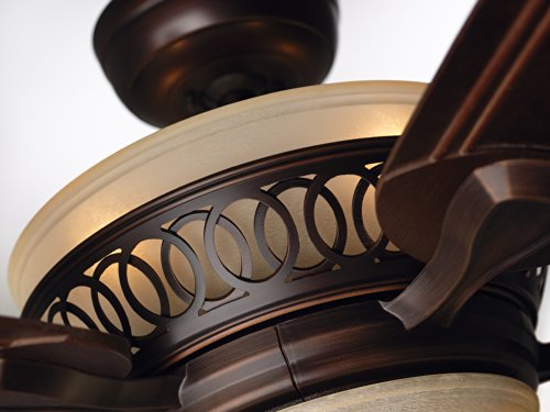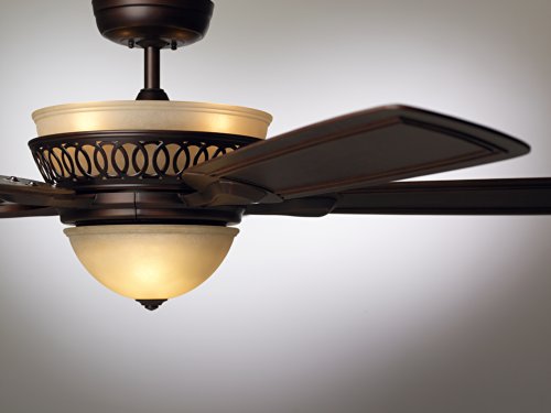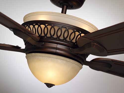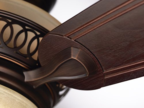 The 54-inch Braddock ceiling fan features a beautiful integrated light fixture with Amber Mist glass, offset by a transitional housing design in Venetian Bronze and Dark Mahogany hand carved blades. Braddock Venetian Bronze finish ceiling fans offer scrolling details in the upper band and provide a simple yet elegant look, creating visual interest in any room. Indoor ceiling fans offer an energy efficient way of cooling down your living space, and the Braddock allows for you to do that with ease, using the 4-speed LED remote control and receiver. Emerson Braddock ceiling fans feature a Limited Lifetime Motor Warranty.Feature