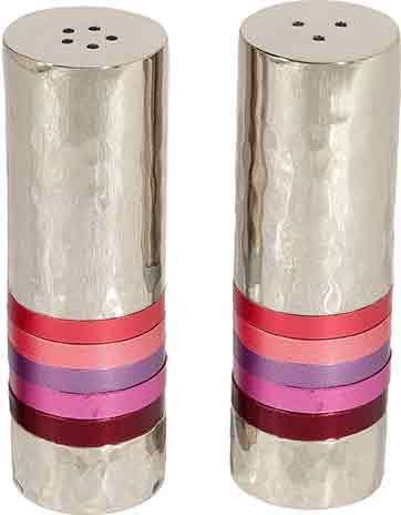 Yair Emanuel Salt and Pepper Shaker Hammered Nickel - Shades of Pink and Red Maroon Rings (SAB-3)