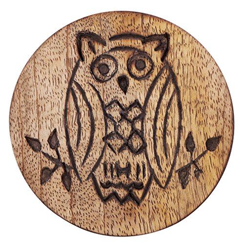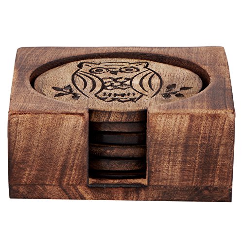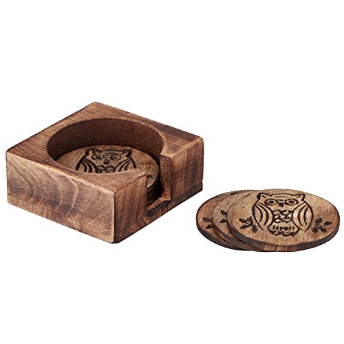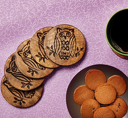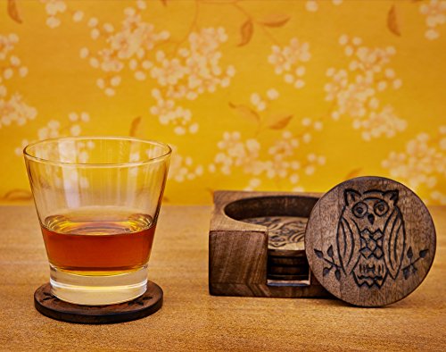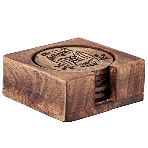 Drink an Coasters Set of 6 Wooden for Tea Coffee Beer Beverage Glass Dining Owl Design Handcrafted Tabletop Home Decor Kitchen Accessories (Owl 1)