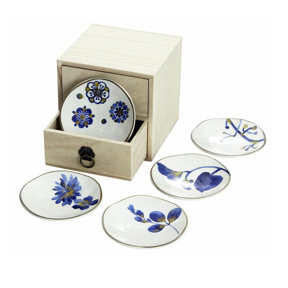 花紋、鉄線・菊、木立、萩、つる唐草を描いた小皿5枚を引出し木箱に入れたセットです。