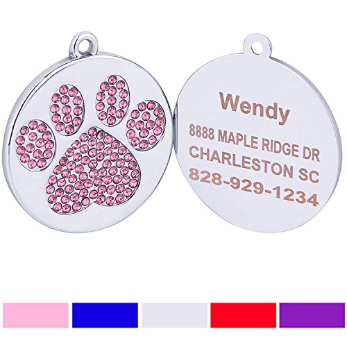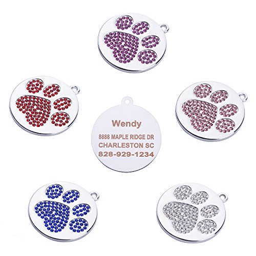 2017 Newest Rhinestone Paw Print Pet ID Tags by Taglory Who are we? We taglory are Pet Tag Manufacoty and we are alway focus on making TAG GLORY. We sold the best tags to pet lovers and other sellers all around the world. Product Feature: Material - Stainless Steel,Rhinestones Design - Round with Diamonds Paw Print Size - 1.0"x1.0"(25mmx25mm),2.5mm thick Etched Craft - Laser Printed with Clear Characters Breed Recommended - Medium Big Dogs,Akita,German Shepherd,Dogue,Dogo,Mastiff,Tibetan Mastiff,German doberman Pinscher,Golden retriever,Greyhound,Fila Brasileiro,Mountai,Dalmatian,Rottweiler,Terrier,Komondor,Afghan Hound,Bernard,Alaskan Malamute,Labrador Retriever,Newfoundland,Landseer,Leonberger,Central Asia Shepherd,Caucasian Shepherd Dog,Giant Schnauzer,Border Collie,Shar Pei,Puli,Shiba,Beagle,Chow Chow,Australian Shepherd,Pumi,Basset Hound,Husky,Shikoku,Canaan Dog,Whippet,Standard Schnauzer,Spaniel,Bulldog,Greenland Dog,Basenji,Portuguese Water Dog,Pharaoh Hound,Australian Cattle Dog,Belgian Shepherd Dog,Pomeranian,Pug,Shih Tzu,Pekingese,Bichon Frise,Yorkshire Terrier,Chihuahua,Miniature Pinscher,ALittle Lion Dog,Scottish Terrier,Maltese,Japanese Spitz Package - 1 Tag Guarantee - 90 days for No Reason Return Refund Replacement 0